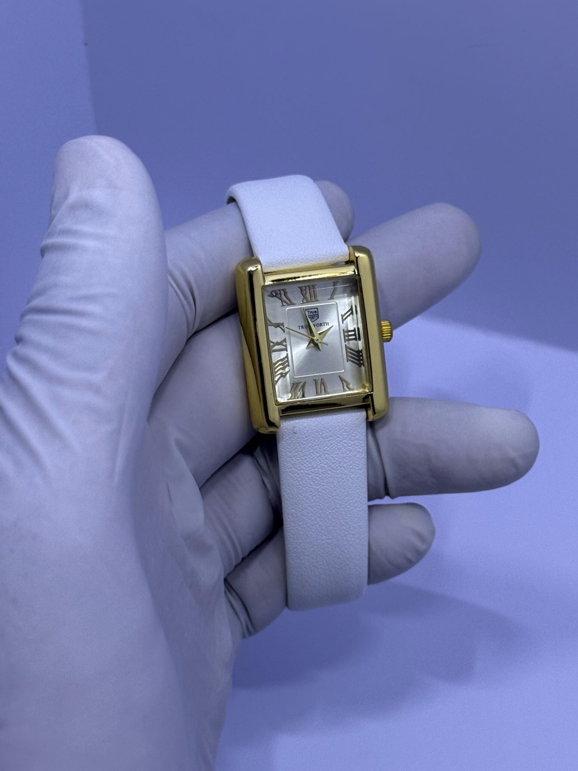 The TrueWorthTM Roman Dial Watch is designed for women who appreciate sophisticated style, so step into timeless elegance with it. 💛 It has a gentle metallic white dial with golden Roman number markings and a gorgeous rectangular casing made of glossy gold. finished with a strap of pure white leather, providing a classy, refined appearance that goes well with any ensemble, from evening wear to business casual 🎯 A stylish, multipurpose piece that elevates any wrist